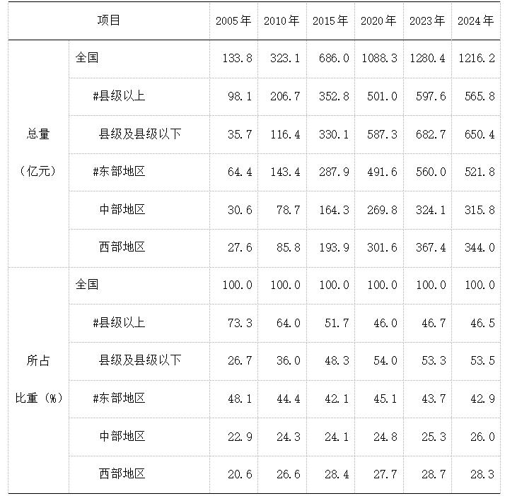 全國(guó)文化和旅游事業(yè)費(fèi)中,縣級(jí)以上文化和旅游事業(yè)費(fèi)565.8億元,占46.5%,比重比上年下降了0.1個(gè)百分點(diǎn);縣級(jí)及縣級(jí)以下文化和旅游事業(yè)費(fèi)650.4億元,占53.5%,比重比上年提升了0.1個(gè)百分點(diǎn)。東部地區(qū)文化和旅游事業(yè)費(fèi)521.8億元,占42.9%,比重比上年下降了0.8個(gè)百分點(diǎn)。中部地區(qū)文化和旅游事業(yè)費(fèi)315.8億元,占26%,比重比上年提高了0.7個(gè)百分點(diǎn)。西部地區(qū)文化和旅游事業(yè)費(fèi)344億元,占28.3%,比重比上年下降了0.4個(gè)百分點(diǎn)。