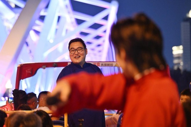 “相聲巴士”的定制化夜間游覽線路,將古文化街、鼓樓、意式風(fēng)情區(qū)、解放橋、天津站世紀(jì)鐘、津灣廣場、望海樓、“天津之眼”摩天輪等20余處地標(biāo)景點串聯(lián)成線。演員在途中結(jié)合景點進行講解,讓觀眾除了能享受海河兩岸夜景和沉浸式津味相聲外,還能深入了解天津歷史,品味天津特色文化。