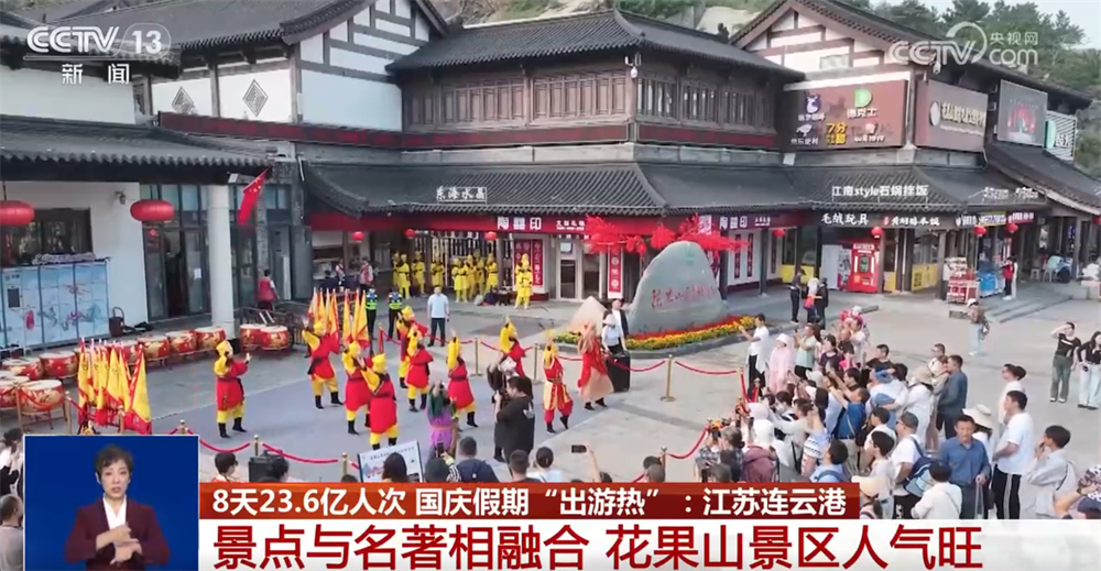 沿著蜿蜒山路,游客們拾級而上,走進(jìn)“水簾洞”登上“玉女峰”,感受藍(lán)天如洗、白云舒展的豪邁。不少游客還在山頂揮舞國旗,慶祝共和國生日。花果山景區(qū)將景點與名著深度融合,為游客準(zhǔn)備了取材自《西游記》精彩片段的情景演出,分布在游客上山的途中,精彩節(jié)目輪番登場,為游客營造出熱鬧喜慶氛圍。