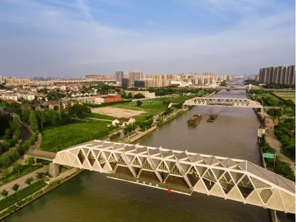 在滸墅關(guān),順應(yīng)民生所需,以文脈傳承、文化賦能滿足人民群眾對美好生活的向往,“紅房子”并非個例。就在距“紅房子”咫尺之遙的大運(yùn)河上,造型別具一格的滸關(guān)南橋、北橋吸人眼球。橋身,大量運(yùn)用三角形與菱形元素,充分彰顯現(xiàn)代結(jié)構(gòu)美學(xué);橋中,幾座“尖頂閣樓”突起,是特意營造的觀水場所;橋下,運(yùn)河汩汩流淌,一艘艘貨輪推開波紋向前駛?cè)ァ?/p>