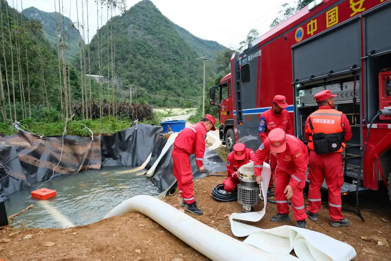 德保多睦村采用 “埡口筑壩攔上游、管道抽排泄內(nèi)澇”策略。中國安能、華錫救援隊(duì)等專業(yè)力量累計(jì)拋填土石方 940 立方米,抽排積水超 27 萬立方米。