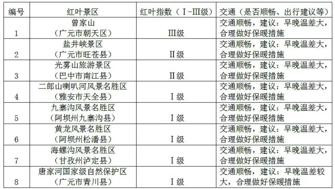 值得一提的是,近期較適宜觀賞紅葉的景點(diǎn)主要分布在四川省東北部曾家山、鹽井峽、光霧山景區(qū)。但今年受閏月和氣候等因素影響,預(yù)計紅葉觀賞期較往年推遲10~15天。