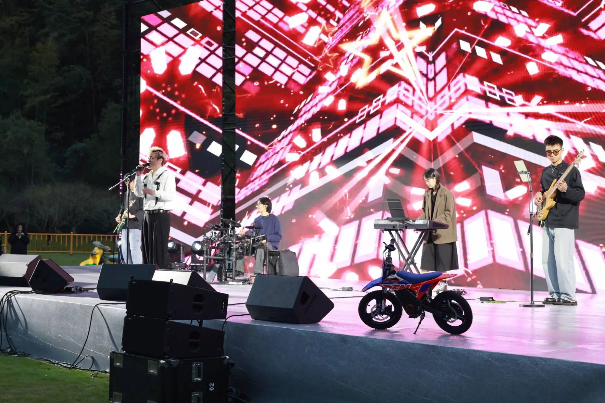隨著機(jī)車隊(duì)伍陸續(xù)抵達(dá),十九峰大草坪迅速化身為音樂(lè)狂歡的海洋。從午后到夜晚,舞臺(tái)持續(xù)高能輸出。搖滾樂(lè)隊(duì)點(diǎn)燃全場(chǎng)熱情,流行金曲引發(fā)集體合唱。