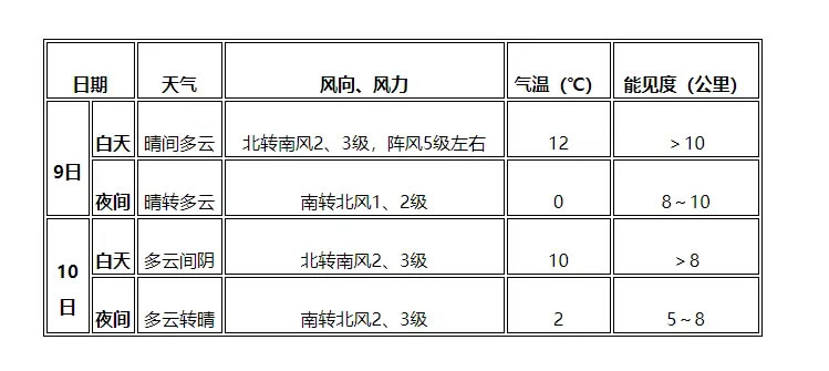 9日中午至10日中午:煙大航線天氣為陰,西北風(fēng)轉(zhuǎn)南風(fēng)5~6級(jí)。瓊州海峽天氣為多云間陰,東北風(fēng)5~6級(jí)、陣風(fēng)7級(jí)。兩岸“小三通”兩馬航線天氣為小雨轉(zhuǎn)陰,東北風(fēng)4~5級(jí)、陣風(fēng)6~7級(jí),夜晨部分時(shí)段有能見(jiàn)度不足10公里的輕霧,對(duì)水上航線有一定影響;廈金航線天氣為陰到多云,東北風(fēng)5~6級(jí)、陣風(fēng)7級(jí)增強(qiáng)至6~7級(jí)、陣風(fēng)8級(jí),對(duì)水上航線有一定影響。舟山水域天氣為多云,偏北風(fēng)6~7級(jí)、陣風(fēng)8級(jí),10日減弱至東北風(fēng)5~6級(jí),對(duì)水上航線有一定影響。