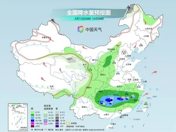 昨天,南方仍有大范圍降雨,同時(shí)青藏高原多地出現(xiàn)降雪天氣。監(jiān)測(cè)顯示,昨天8時(shí)至今天6時(shí),湖南南部、江西南部、福建西北部等地部分地區(qū)出現(xiàn)中到大雨,湖南衡陽(yáng)、江西贛州等局地大暴雨;青海北部和東部、西藏東部、川西高原等地部分地區(qū)出現(xiàn)中到大雪或雨夾雪,四川甘孜局地暴雪。