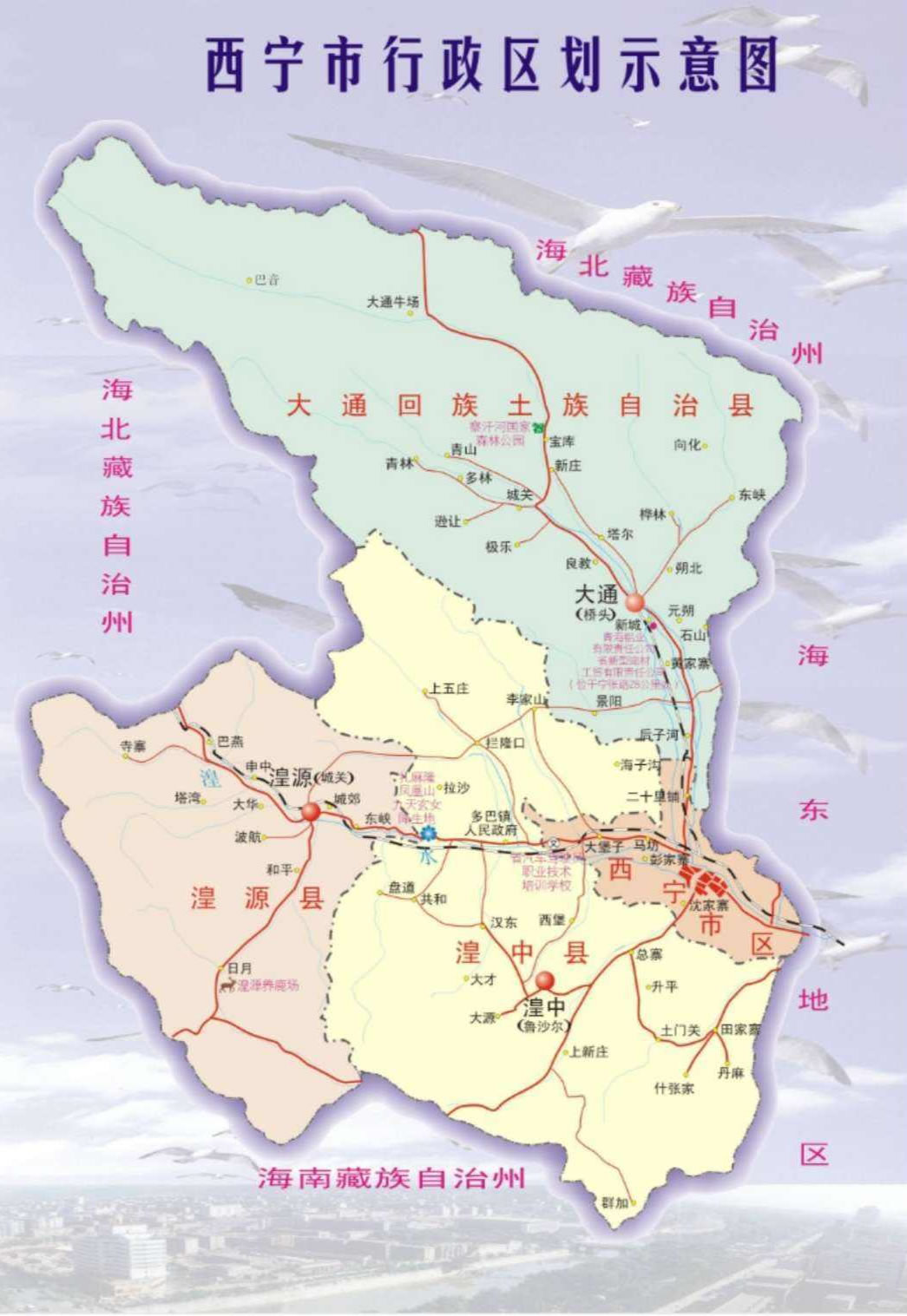 大通回族土族自治縣 面積3090平方千米,人口403368,政府駐橋頭鎮(zhèn),下轄9個(gè)鎮(zhèn)、11個(gè)鄉(xiāng)