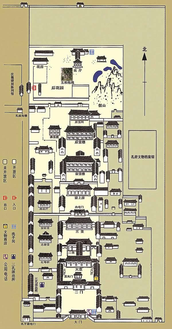 孔府占地240畝,共有廳、堂、樓、房463間。九進(jìn)庭院,三路布局:東路 即東學(xué),建一貫堂、慕恩堂、孔氏家廟及作坊等;西路即西學(xué),有紅萼軒、忠恕堂、安懷堂及花廳等;孔府的主體部分在中路,前為官 衙,有三堂六廳,后為內(nèi)宅,有前上房、前后堂樓、配樓、后六間等,最后為花園。