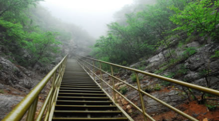 位于旅游南線,從下到上,一共有488級階梯,上下直線距離近兩百米,是連接南線進(jìn)入景區(qū)絕佳景觀的必經(jīng)之路,直上直下,有“平步青云”的寓意。