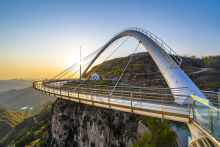 玻璃橋為無背索斜拉弧形玻璃橋,建于潭溪山海拔700米的崖壁之上,橋面跨度117米,懸空高度101米,外弧最大半徑90米,總承載可達(dá)900噸,單次承載10000人。玻璃橋整體由百米觀光電梯、懸崖酒店及玻璃橋體組成。其中,百米觀光電梯采用全景玻璃設(shè)計,依懸崖而建,集觀光、代步、游覽為一體。橋體的彩虹狀獨特造型,充滿動感與美感,且與山崖風(fēng)格渾然一體。潭溪山高空玻璃橋迄今為止,潭溪山高空玻璃橋已獲得兩項國際大獎:2019年世界結(jié)構(gòu)大獎——行人橋梁獎,2020年國際橋梁大會(IBC)——亞瑟·海頓獎。