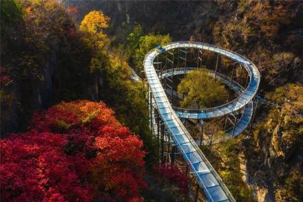 滑道自高門洞起,至空中玻璃漂流入口處止,長約千米。此處山坡陡斜,樹木茂密,滑道從樹叢中順山勢蜿蜒而下,看似蟒行山間草叢中。其中有八個急彎,落差較大,乘坐滑道飛速從山頂滑至山腰,驚險刺激,樂趣無窮。
