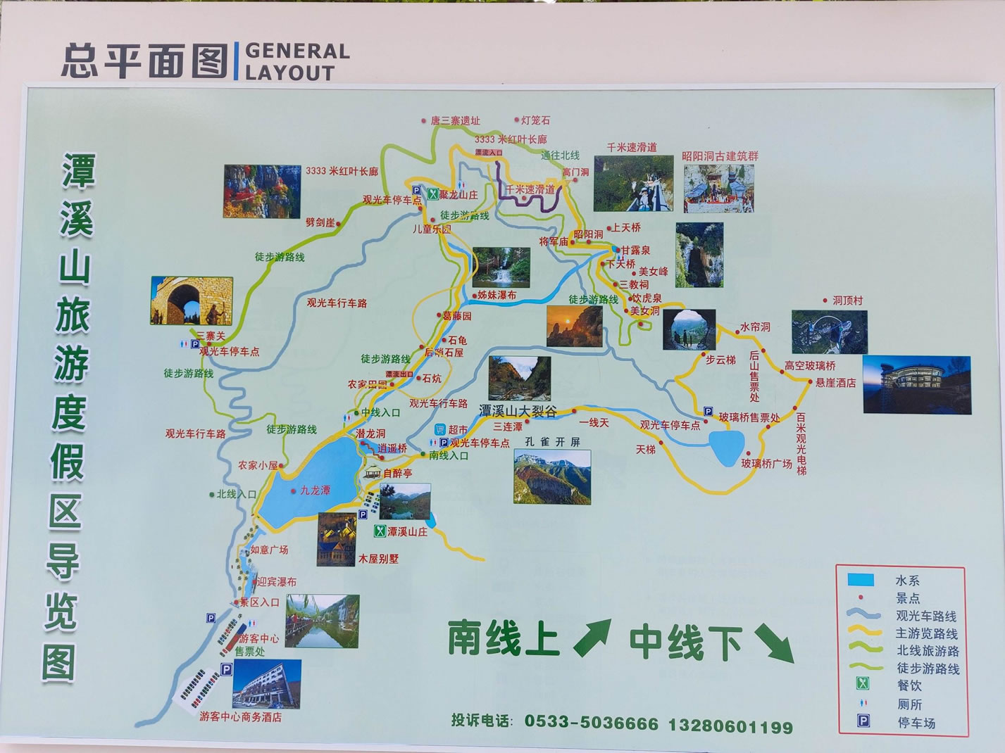旅游中線:全程約1小時,以農(nóng)家風(fēng)光、休閑娛樂為特色,主要景點有:潭溪山大瀑布、如意廣場、九龍?zhí)丁⑻断角f、自醉亭、潛龍洞、逍遙橋、潭溪山古酒坊、農(nóng)家田園、后哨石屋、櫻桃峪、神龜探路、姊妹瀑布、兒童撒野樂園、乘觀光車下山。 |