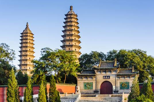 永祚寺雙塔,雄偉異常,雙雙聳立如筆,故有“文筆雙塔”之譽,更被譽為太原的標志。雙塔并非同時建成,東南塔稍早,西北塔較晚。兩塔相距60米,取“真言密教以十六數(shù)表圓滿無盡”之意。二塔均為全磚石結構,只在各層角檐內(nèi)裝有一根挑木,構建技巧十分精湛。
