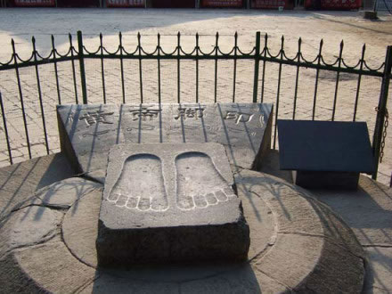 整塊石頭約一平方米。青石面上,鐫刻有黃帝腳印一雙。民間有向黃帝腳印投硬幣或零錢(qián)以測(cè)運(yùn)氣的習(xí)俗,據(jù)說(shuō)投向腳印大拇趾運(yùn)氣最好,為大吉大利。