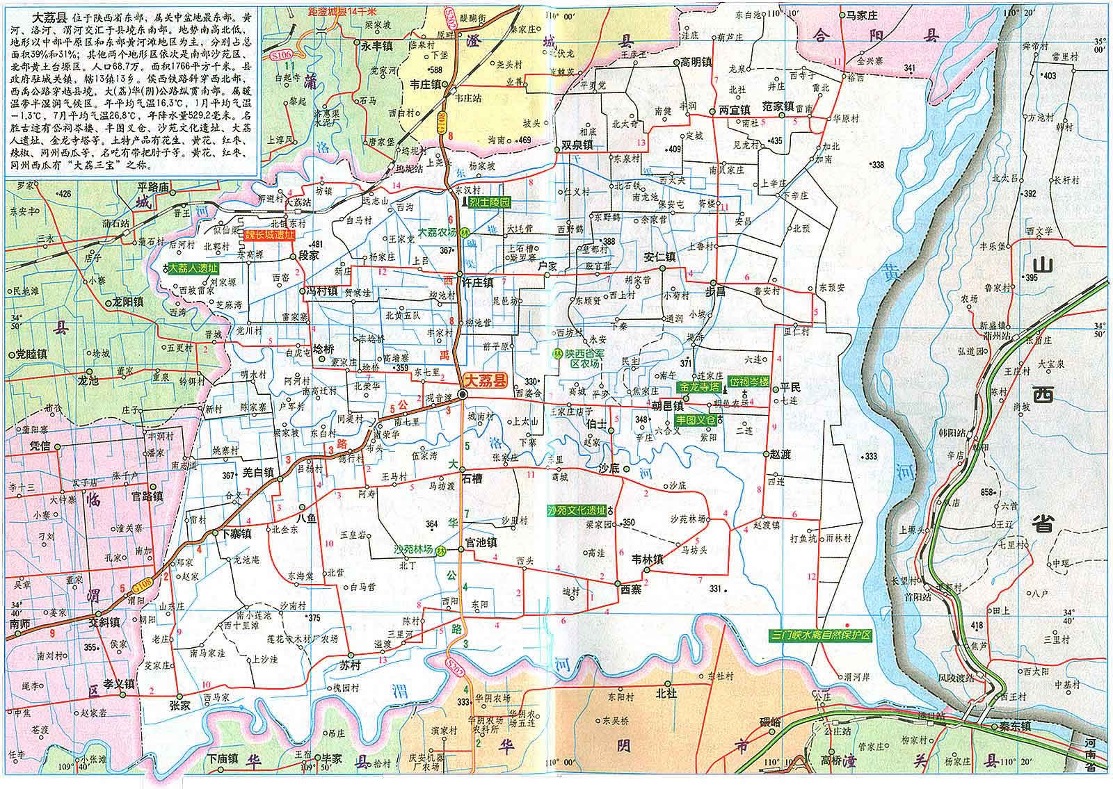 大荔縣位于關中平原東部,是黃 、洛、渭三河匯流之地。南界渭河與潼關、華陰、華縣為鄰,西繞洛河與蒲城、臨渭區(qū)毗連,北沿臺塬與澄城、合陽縣接壤,東瀕黃河與山西永濟相望,素有"三秦通衢"、"三輔重鎮(zhèn)"之稱。大荔縣總面積為1776.1平方公里,全縣轄7鎮(zhèn)26鄉(xiāng),414個行政村?側丝72萬人。