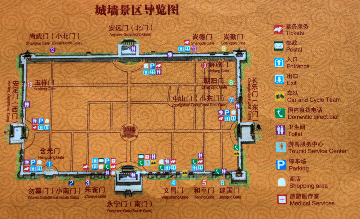 民國(guó)后至新中國(guó)成立后,新辟城門12座,東有朝陽門、中山門,北有解放門、尚武門、尚德門,西有玉祥門,南有含光門、勿幕門、朱雀門、和平門、文昌門、建國(guó)門。