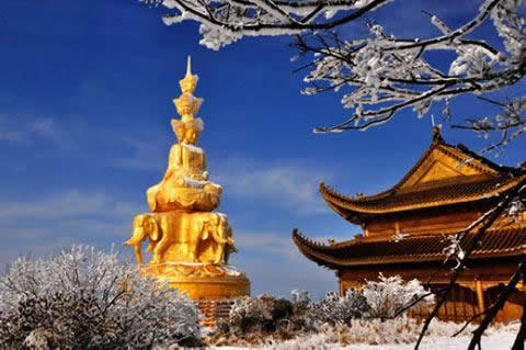金頂是峨眉山的象征,金佛是峨眉山的標(biāo)志。金頂是峨眉山景點(diǎn)和寺廟的匯集,48米高的四面十方普賢金像矗立在金頂。