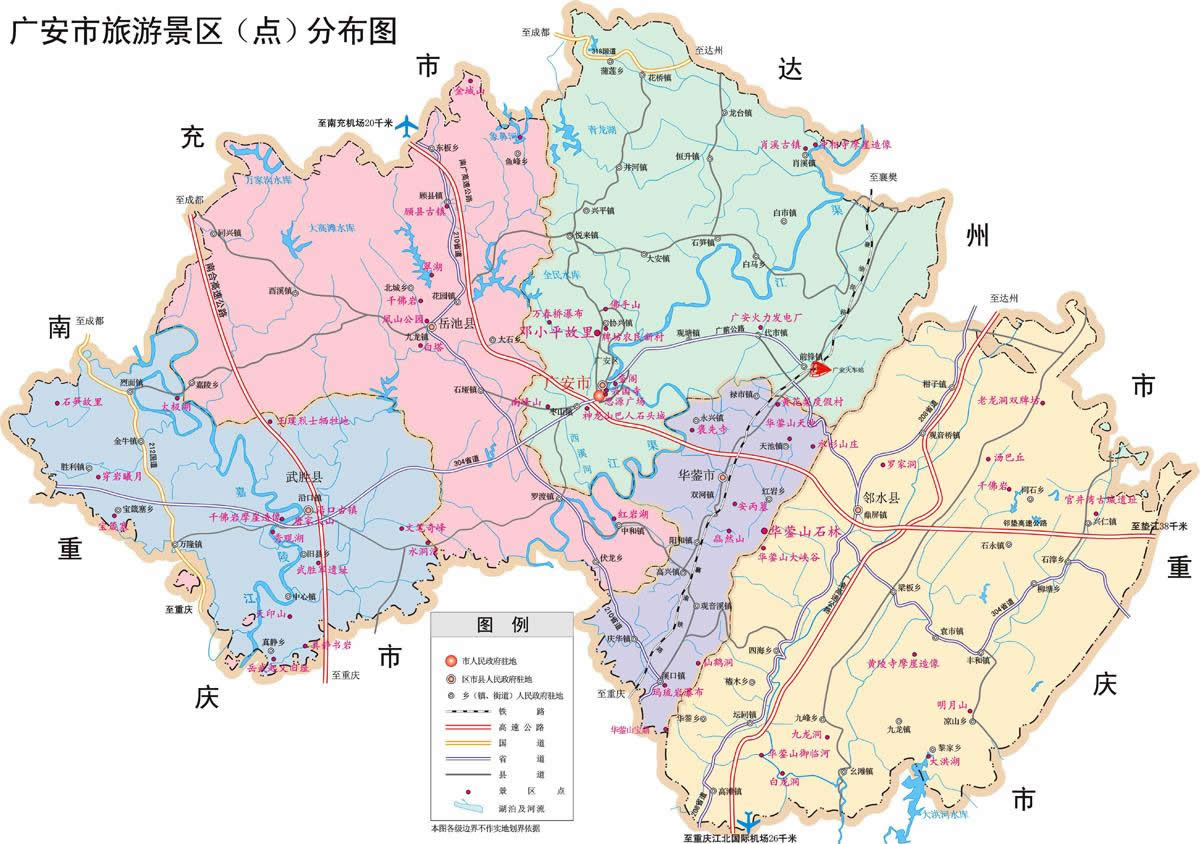 廣安市轄2個市轄區(qū)、3個縣、代管1個縣級市: