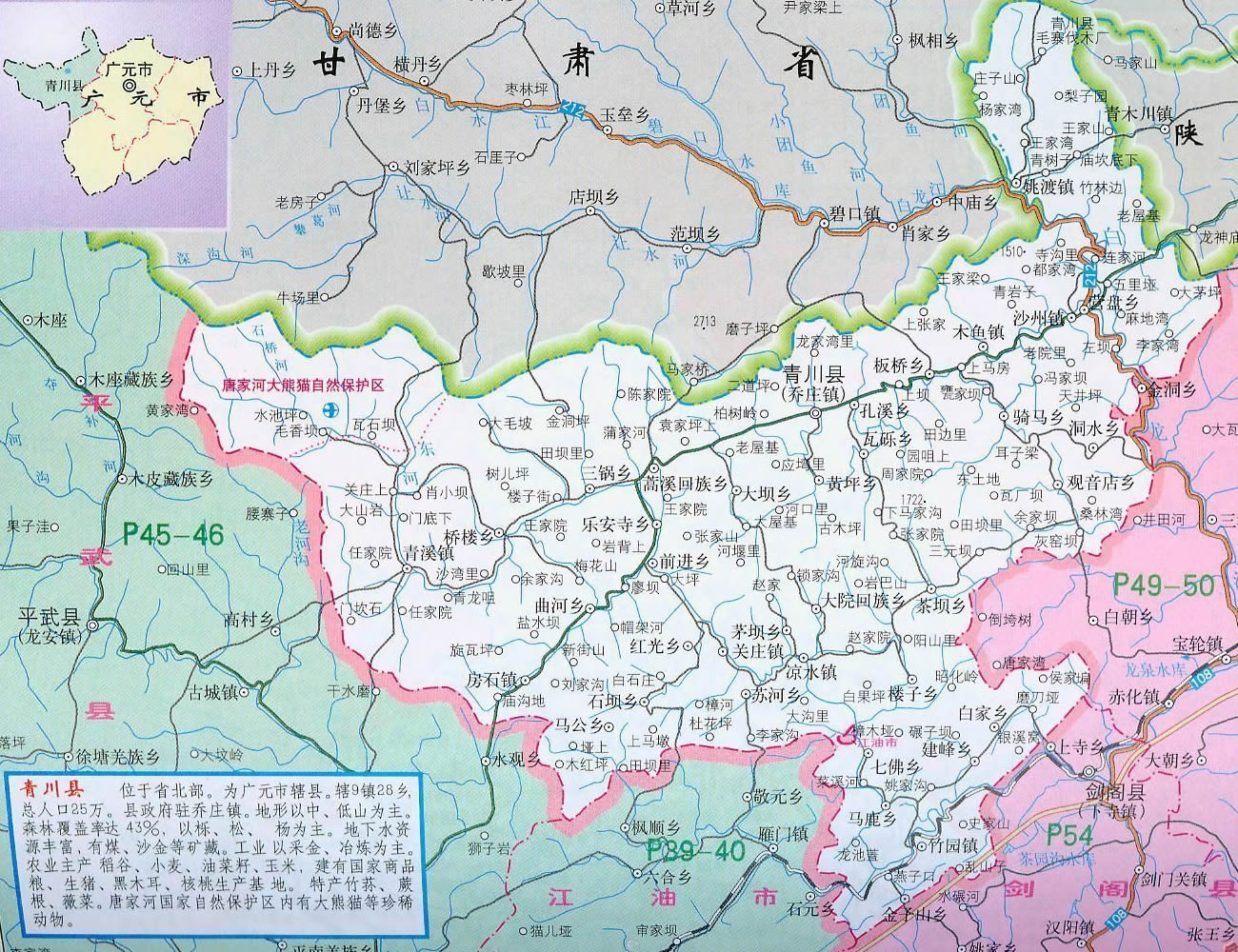 青川縣轄9個(gè)鎮(zhèn)、25個(gè)鄉(xiāng)、2個(gè)民族鄉(xiāng)、1個(gè)國(guó)家級(jí)自然保護(hù)區(qū):