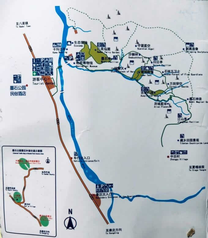 中國墨石公園景區(qū)位于四川省甘孜州道孚八美鎮(zhèn)卡瑪村與中古村交界處,地處中國最美景觀大道318國道核心區(qū),緊鄰丹巴美人谷、康定新都橋、雅江康巴漢子村等知名景區(qū),距八美鎮(zhèn)約6公里,川藏公路旁400米處。面積5平方公里,海拔約3500米。是香格里拉之巔海螺溝通向香格里拉之魂稻城亞丁的中轉站,擁有壯美草原、婉約濕地、奇幻墨石、特色民居、高原花海、金色彩秋、白塔圣寺、日出日落八大奇觀。“春賞格桑夏避暑,秋觀彩林冬踏雪”是一年四季風光的特色,而綿延在鮮水河斷裂帶上的墨石天然景觀更為世人向往,被譽為“中國最美景觀大道第八美”。
