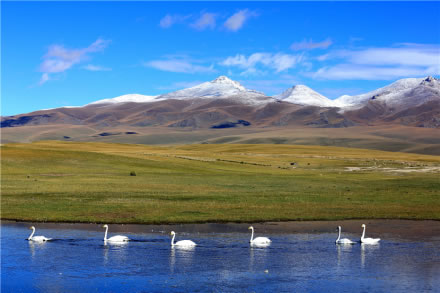 天鵝湖坐落在草原上,在新疆和靜縣巴音布魯克區(qū)政府約60千米的巴音鄉(xiāng)西南部。天鵝湖實際上是由眾多相互串聯(lián)的小湖組成的大面積沼澤地,這是中國第一個天鵝自然保護區(qū)。保護區(qū)水草豐茂,氣候濕爽。鳥類有128種,隸屬14目30科80余屬,其中雀形目53種,非雀形目75種;繁殖鳥95種,占74%,其中留鳥34種,棲息著中國最大的野生天鵝種群,是鳥類繁殖和渡夏的棲息地。獸類有20余種,其中,兩棲類2種,魚類5種。其中屬國家Ⅰ類保護的有8種,如雪豹、黑鸛、金雕、白肩雕等,Ⅱ級保護的有25種,如天鵝、盤羊、雪雞等。