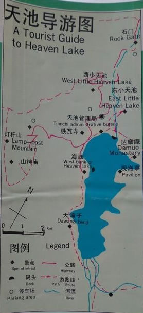 從鱷魚(yú)壩上南望博格達(dá)峰,這是天池八景的最后一景“南山望雪”,另外七景依次是以上提及的“石門(mén)一線”、“龍?zhí)侗淘隆、“懸泉飛瀑”、“定海神針”、“西山觀松”、“頂天三石”和“海峰晨曦”,以上有關(guān)此八景的《天池八景詩(shī)》由當(dāng)代詩(shī)人謝玉康所作。從鱷魚(yú)壩可擺渡到天池南岸,到南岸后繼續(xù)向南行。