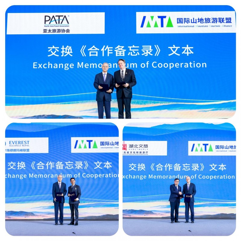 國際山地旅游聯(lián)盟副主席兼秘書長何亞非分別與亞太旅游協(xié)會(huì)主席彼得·西蒙(Peter Semone)、尼泊爾珠穆朗瑪峰聯(lián)盟主席蘇大山·尼泊爾(Sudarshan Nepal)、湖北省文化和旅游廳副廳長徐勇交換合作備忘錄,旨在通過資源共享、優(yōu)勢(shì)互鑒,為全球旅游業(yè)可持續(xù)增長注入新動(dòng)能、貢獻(xiàn)實(shí)踐力量。