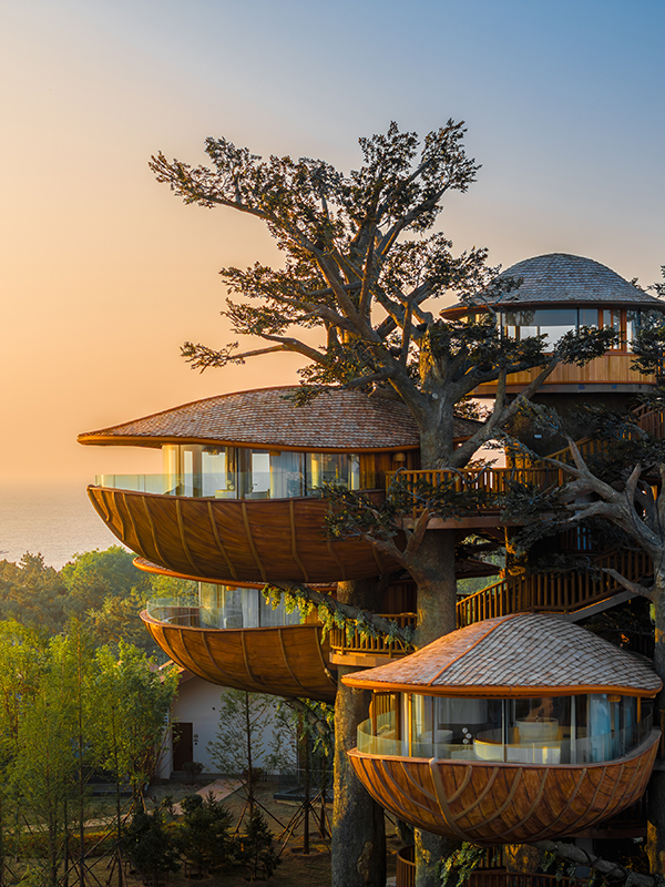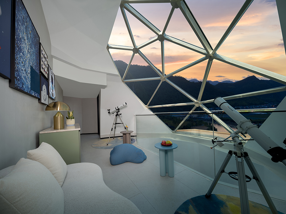 架空設(shè)計的海螺屋客房隱于林間,如同童話故事中的精靈居所,為住客營造出私密而夢幻的休憩空間;天文臺客房懸于巖壁之上,通過客廳的望遠(yuǎn)鏡和全景天窗可賞星河美景,將浩瀚星空引入室內(nèi);炭晶舍客房以傳統(tǒng)炭雕藝術(shù)為靈感,通體的炭黑色藝術(shù)感十足,展現(xiàn)出材料與自然的深度對話;復(fù)式結(jié)構(gòu)的玉江舍客房,則讓賓客在空間轉(zhuǎn)換中,收獲山川、江潮等不同的觀景視野,實(shí)現(xiàn)移步換景的居住意境。