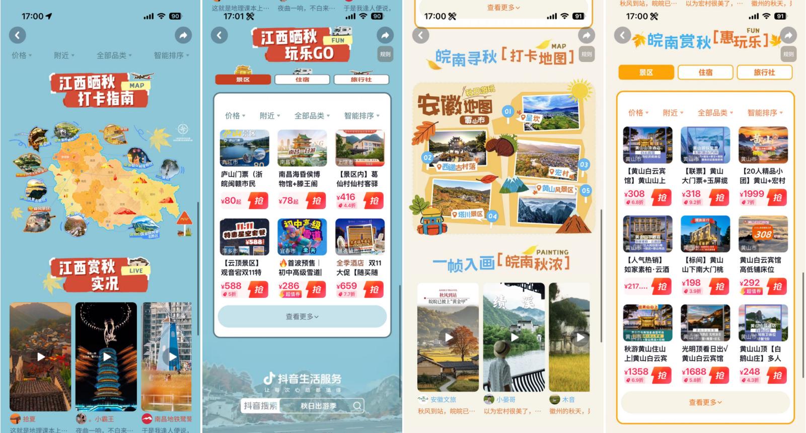 抖音深度響應(yīng)用戶對(duì)季節(jié)限定體驗(yàn)的需求,以“秋日儀式感”為切入點(diǎn),聯(lián)動(dòng)江西和安徽多城自然人文類商家,分別發(fā)起#來江西曬個(gè)秋 與#賞皖南秋意濃 話題活動(dòng),累計(jì)收獲話題總播放量2945萬(wàn),用戶投稿4275條,相關(guān)搜索UV突破406萬(wàn),同比增長(zhǎng)19%。從江西婺源的篁嶺景區(qū)到安徽黃山的三塔景區(qū),從葛仙村的千燈夜游到三清山的云海勝景,抖音平臺(tái)的內(nèi)容生態(tài)與交易場(chǎng)景實(shí)現(xiàn)深度融合,推動(dòng)江西與安徽兩地文旅目的地整體支付達(dá)GMV2.22億元,同比增長(zhǎng)246%,讓從發(fā)現(xiàn)出行靈感至完成目的地消費(fèi)的全過程更加順暢自然。