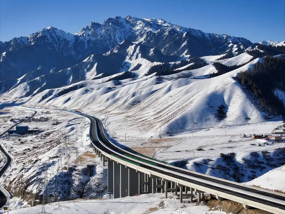 12月下旬,記者驅(qū)車從烏魯木齊前往烏尉高速采訪。寒風(fēng)掠過天山山脊,皚皚白雪覆蓋著險(xiǎn)峻山群,層巒疊嶂之中,一條大道向前鋪展,于天山內(nèi)部打通條條隧道,在崇山峻嶺間架設(shè)橋梁。