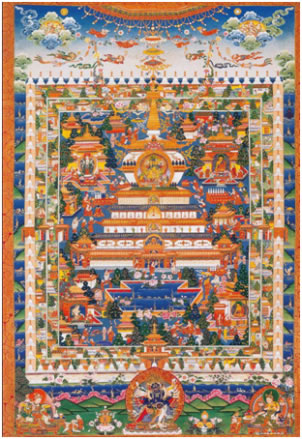 除佛像、佛塔外,唐卡收藏也是一大亮點。羅布林卡珍藏了大量18到20世紀(jì)勉唐畫派、欽則畫派和嘎赤畫派的各類作品。早期唐卡著名的有覺仲師徒像、帕木竹巴·多吉杰布像、印度尊者比瓦巴、那若巴像。其中覺仲師徒像唐卡,描寫的是印度尊者,噶當(dāng)派始祖阿底峽向貼身弟子仲敦巴(師徒合稱“覺仲”)傳授佛法的故事。畫面中心主尊阿底峽頭戴錐形遮耳帽,身披袈裟,雙手結(jié)說法印,給身旁仲敦巴講法,仲敦巴著藏式袍服,結(jié)跏趺坐,側(cè)身聆聽大師教誨。畫面上、下分別繪有如來、藥師、觀音、度母諸佛及繪畫施主像,人物刻畫逼真、栩栩如生,背景以朱砂填色,輪廓用金線勾勒。這件13世紀(jì)繪制的“赤唐”作品,十分稀有,彌足珍貴。另外,在收藏諸多的嘎赤畫派作品中,以84位印度大成就者唐卡最具特色。這些唐卡的畫面,不同以往其他畫派作品,構(gòu)圖較為簡潔,色彩淡雅。人物形態(tài)被描繪的極為夸張,塑造了一個個特殊而詼諧逗趣的大成就者形象。這種一反常態(tài)的畫風(fēng)作品,在外邊難得一見。還有以唐卡形式繪制的《四部醫(yī)典系列掛圖》,收藏也比較完整。系列掛圖,藏族稱為“曼唐”,它是以彩色連環(huán)畫形式系統(tǒng)描述了藏醫(yī)藥學(xué)的基本理論,人類解剖構(gòu)造,生理功能、疾病診斷治療方法,各種藥物種類以及人類如何養(yǎng)生保健、飲食搭配等內(nèi)容!奥啤敝谱魍晟朴谇宕迨肋_賴?yán)锇⑼迳<未雸?zhí)政時期。最早成79幅,1916年十三世達賴?yán)锪钊擞衷鲅a了一幅“歷代西藏名醫(yī)圖”,形成80幅。這批系列掛圖,被視為標(biāo)準(zhǔn)藍本,完整保存在羅布林卡內(nèi)。