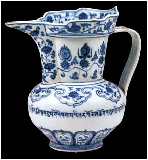 明宣德時期(公元1426年--1435年)贈送的青花纏枝蓮紋僧帽壺,高23cm,底徑9cm。該壺是仿藏傳佛教僧人的僧帽所制,故稱“僧帽壺”。壺的通體飾青花紋樣,腹部書寫一圈藏文,意為“晝吉祥、夜吉祥、正午吉祥、晝夜吉祥、三寶吉祥”。但這圈銘文中的藏文字母和分隔符號書寫有誤,可見這是不通藏文的漢族工匠仿書。足墻飾美麗的卷草紋,器底青花雙圈書寫兩行六字“大明宣德年制”。宣德青花瓷以其古樸典雅的造型,晶瑩艷麗的釉色,多姿多彩的紋飾聞名于世。宣德時期西藏與內(nèi)地往來綿密,大量的青花瓷做為皇帝贈品傳入西藏。西藏上層為保存這些瓷器不致受損,還用金屬或皮革制成瓷套盛裝。此件瓷壺從造型到紋飾,多含西藏元素,顯然它是朝廷命景德鎮(zhèn)官窯專門燒制贈予西藏上層的。