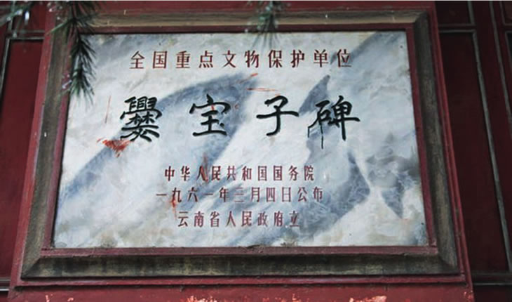 在越州楊旗出土的爨寶子碑全稱為“晉故振威將軍建寧太守爨府君墓”碑,立于東晉大亨四年(公元405年)!鹅鄬氉颖肥请`書向楷書過渡的典型碑刻;碑文通篇為六朝時期的駢文體;也是研究南北朝時期云南地方史不可多得史料。1961年,國務院將其公布為第一批全國重點文物保護單位。存于曲靖一中。