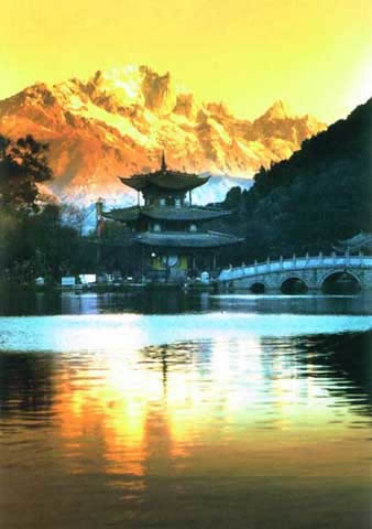 玉龍雪山隨著時(shí)令和明暗的交替,景觀也變幻無常。時(shí)而云蒸霧涌,玉龍乍隱乍現(xiàn),時(shí)而碧天如水,萬里無云,群峰像被玉液清洗過一樣,晶瑩的雪光耀目晃眼,具有"白雪無古今,乾坤失曉昏"的光輝;東方初曉,晨曦罩峰頂,多彩的霞光映染雪峰,白雪呈緋紅狀與彩霞掩映閃爍;傍晚,斜輝把雪峰染抹得像披上紅紗,云朵帶