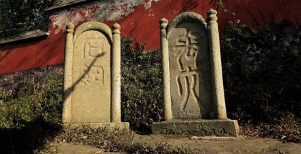 龍杠,位于入口處的大禹陵牌坊前一橫臥的青銅柱子,名龍杠。龍杠兩側(cè)各有一柱,名拴馬樁。凡進入陵區(qū)拜謁者,上至皇帝,下至百姓,須在此下馬、下轎,步行入內(nèi),以示對大禹的尊崇。龍杠上有“宿禹之域,禮禹之區(qū)”的銘文。
