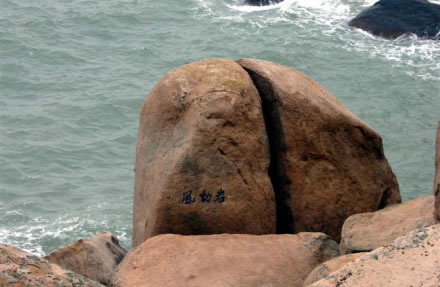 能以人力或風(fēng)力推動(dòng)而搖擺的大巖石,在各地勻有發(fā)現(xiàn)。南麂三盤尾石門旁的風(fēng)動(dòng)巖卻別有情趣。此石高約5.5米,直徑4米,形如銅鼓,卻裂成兩瓣,一瓣是“靜如處子”分外端莊;另一瓣,凡遇上5級(jí)以上大風(fēng),便自行搖動(dòng),可謂“動(dòng)似脫兔”,還以發(fā)出悅耳聲響,宛如海底傳來的進(jìn)軍號(hào)角。倘若無風(fēng)時(shí),那只得勞駕游客,憑力氣去推、去搖。面對風(fēng)動(dòng)巖了,聯(lián)想起佛教中關(guān)于“風(fēng)動(dòng)也,情動(dòng)也,見仁者自己心動(dòng)”的“因緣和合”典故,似乎明白了自然景觀中也充滿生活哲理。此巖其自身根基不穩(wěn),加上風(fēng)的外力,便顯得搖擺不定。
