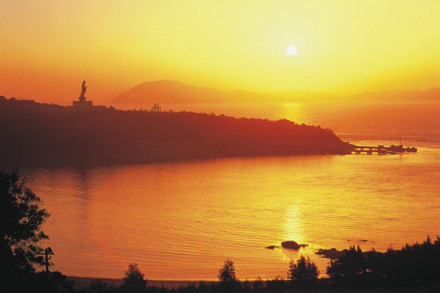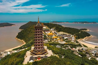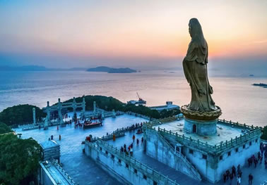 南海觀音立像位于普陀山風(fēng)景名勝區(qū)之東南的龍灣崗巔。這一尊南海觀音立像總高33米,其中臺基高13米,銅像高18米,蓮花座為2米,重70多噸。佛像基層是面積1000多平方的功德廳,上層供奉500尊形態(tài)各異的觀音銅像,下層大廳飾有觀音靈異故事的大型黃楊木雕和以普陀山風(fēng)景名勝區(qū)景色為題材的彩玉浮雕。