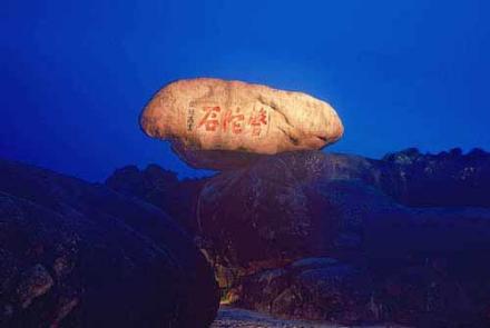 指磐陀石一帶的傍晚景色。由梅福庵西行不遠(yuǎn)處便可看到磐陀石。磐陀石由上下兩石相累而成,下面一塊巨石底闊上尖,周廣20余米,中間凸出處將上石托住,曰磐;上面一塊巨石上平底尖,高達(dá)3米,寬近7米,呈菱形,曰陀。上下兩石接縫處間隙如線,睨之通明,似接未接,好似一石空懸于一石之上!