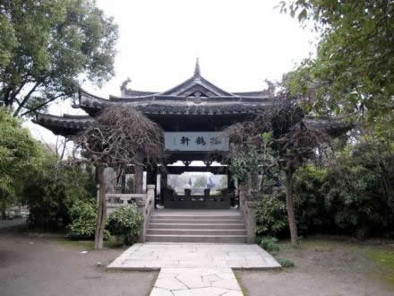 孤鶴軒位于沈園中部,是新辟建園林部分的景觀中心。北臨大荷花池宋池,與東北邊濱水小榭逼遙相對(duì),西邊緊靠六朝井,南邊是遺物壁和明池。軒為單檐歇山頂兩面帶廊的敞廳,平面為倒“凸”字形,寬而臨水。構(gòu)架為仿宋式木構(gòu),下為青石欄板圍起的挑空平臺(tái),造型秀麗曲雅。孤鶴軒亦稱(chēng)“孤鶴哀鳴”處,是陸放翁的自喻。偉大愛(ài)國(guó)詩(shī)人陸游因南宋朝廷昏庸,壯志難以實(shí)現(xiàn),發(fā)出孤鶴的哀鳴,以孤鶴自喻,隱喻詩(shī)人在人生中痛失伴侶,事業(yè)上報(bào)國(guó)無(wú)門(mén)、愛(ài)民有罪、屢遭貶職的坎坷一生。亭內(nèi)有“亭池”遺址,1985年考古發(fā)掘時(shí)在此發(fā)現(xiàn)唐亭閣和明代的假山、魚(yú)池遺址!肮满Q軒”匾額分為內(nèi)外兩塊,內(nèi)匾額由著名書(shū)畫(huà)家、文物鑒定家謝稚柳題寫(xiě),亭外由大康敬書(shū)。